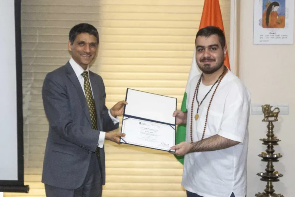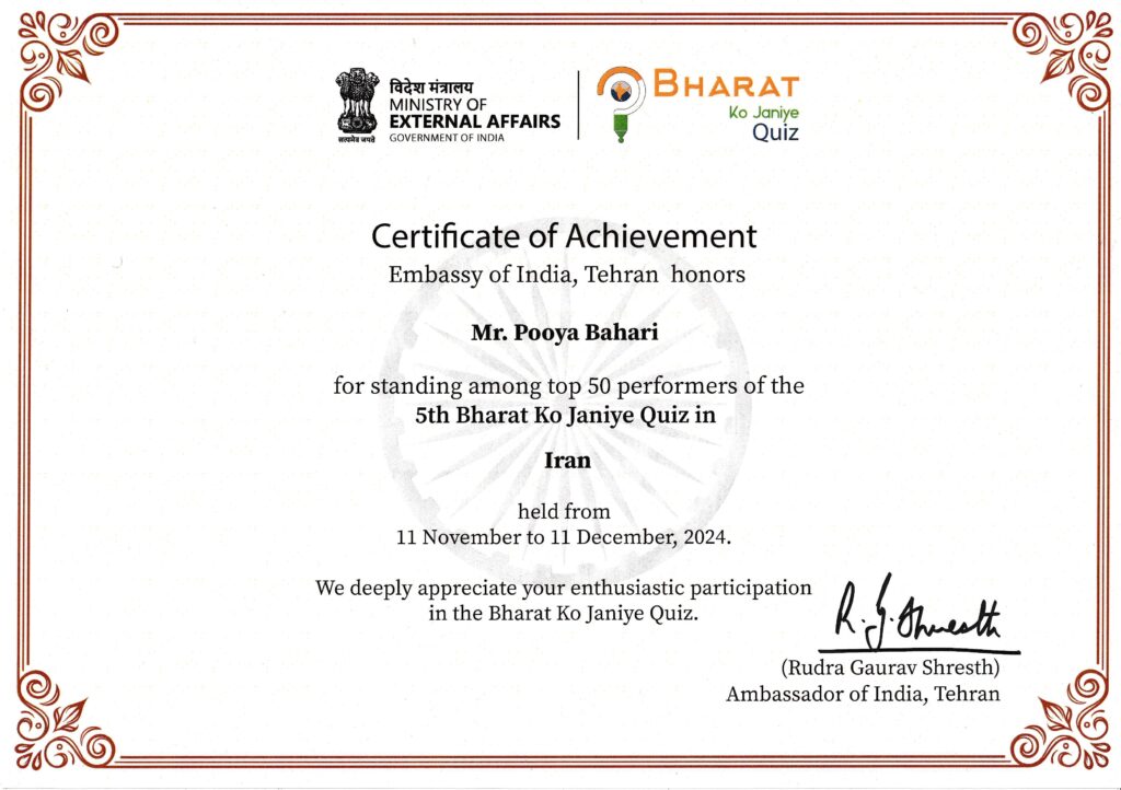 دریافت سرتیفیکیت مسابقه بهارت کو جانیه از سفیر کبیر هندوستان – مرکز فرهنگی سوامی ویوکاناندا (سفارت هند) – 16 اسفند 1403
